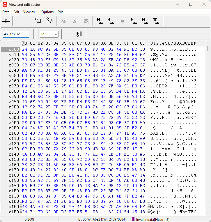 Seagate drives may return factory data when attempting to read weak regions (or with weak head/s). This data will start with sEDU or end with btTEC, as below.
