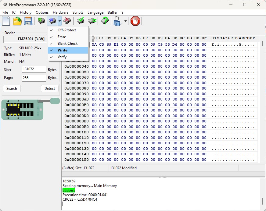 Warning! Never write data to the original patient rom chip. Use only a spare chip. We can program the chip with the "Write IC" button. The drop down menu next to the button allows for the enabling/disabling of the protection removal, erasure, blank checking, and verifying steps (see below).
